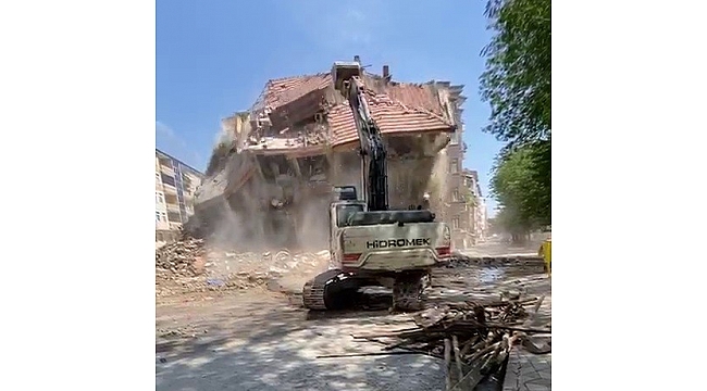 Elazığ'da depremde hasar gören yapıların yıkımı kent genelinde sürerken, 4 katlı bir binanın kontrollü yıkımı korna sesi ve iş makinesi desteği ile gerçekleştirildi.