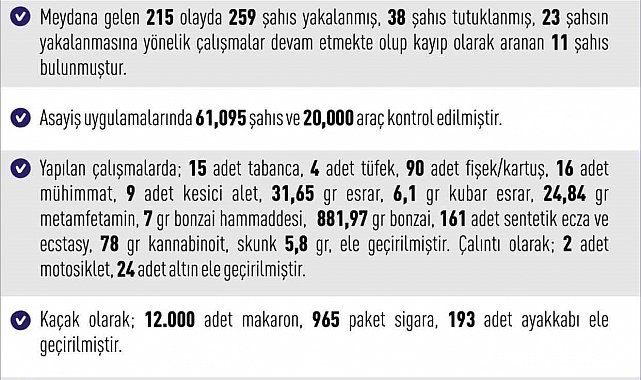 Yapılan çalışmalarda,15 adet tabanca, 4 adet tüfek, 90 adet fişek/kartuş, 16 adet mühimmat, 9 adet kesici alet, 31,65 gram esrar, 6,1 gram kubar esrar, 24,84 gram metamfetamin, 7 gram bonzai hammaddesi, 881,97 gram bonzai, 161 adet sentetik ecza ve ecstasy, 78 gram kannabinoit, skunk 5,8 gram ele geçirildi. Çalıntı olarak, 2 adet motosiklet, 24 adet altın ele geçirildi. Kaçak olarak, 12 bin adet makaron, 965 paket sigara, 193 adet ayakkabı ele geçirildi.