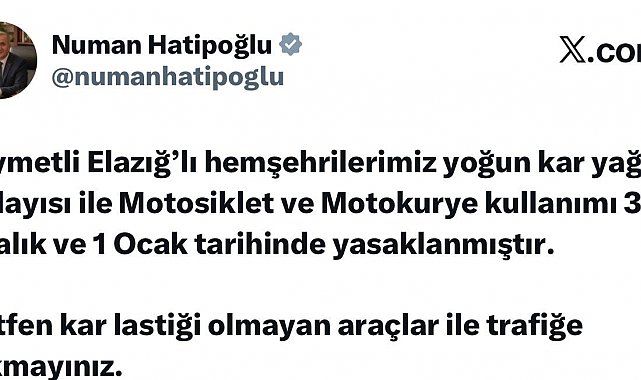 Elazığ Valisi Numan Hatipoğlu, kentte etkili olan yoğun kar yağışı nedeniyle 31 Aralık ve 1 Ocak tarihlerinde motosiklet ve motokurye kullanımının yasaklandığını duyurdu. Vali Hatipoğlu ayrıca, kar lastiği bulunmayan araçlarla trafiğe çıkılmaması konusunda vatandaşları uyardı.