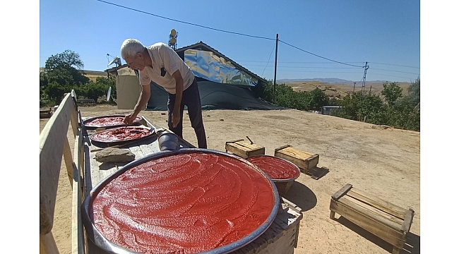 Elazığ'ın Baskil ilçesinde köylülerin odun ateşinde hazırlanan organik salça mesaisi başladı.