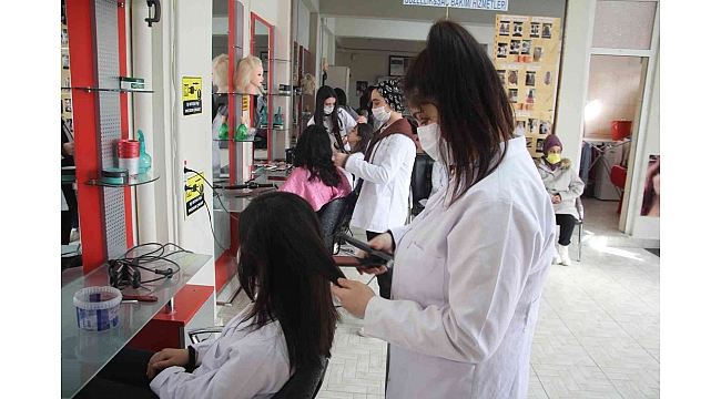Öğrencilerin hem öğrenip hem de ücret kazandıklarını aktaran güzellik ve saç bakım hizmetleri öğretmeni Nevin Kara, "Okulumuzda cilt ve saç bakımı dalı bulunmaktadır. Özellikle 11. sınıfta teorik artı uygulama derslerimiz yoğunlaşmaktadır. Son sınıftaki öğrencilerimiz staja yöneldiği için işletmelere hazır vaziyete getiriliyor. Güzellik ve kuaför salonunda yapılan bütün işlemler okulumuzda da mevcuttur. Bu yüzden daha çok müşteri odaklı çalışmaktayız. Fiyat listelerimiz var. Dışarıdan ve okulumuzun öğretmenleri için iki farklı fiyat uygulanmaktadır. Öğrenciler daha çok uygulama odaklı çalışıyor. Ücretin yarısını döner sermayeye yarısını da öğrenciye kazandırmaktayız. Öğrenci bu şekilde hem eğitim görürken hem de ücret almış oluyor "diye konuştu.
