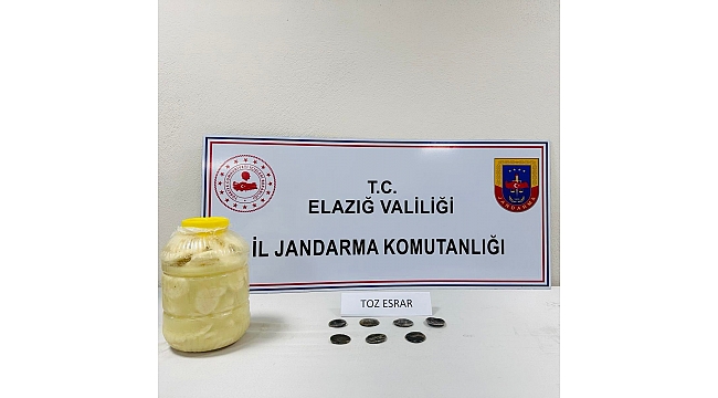 Elazığ'da İl Jandarma Komutanlığı ekipleri tarafından yapılan uyuşturucu operasyonunda, narkotik köpeği Varan'ın tepkisi üzerine kontrol edilen peynir bidonu içerisinde 7 parça halinde 70 gram toz esrar maddesi ele geçirildi.