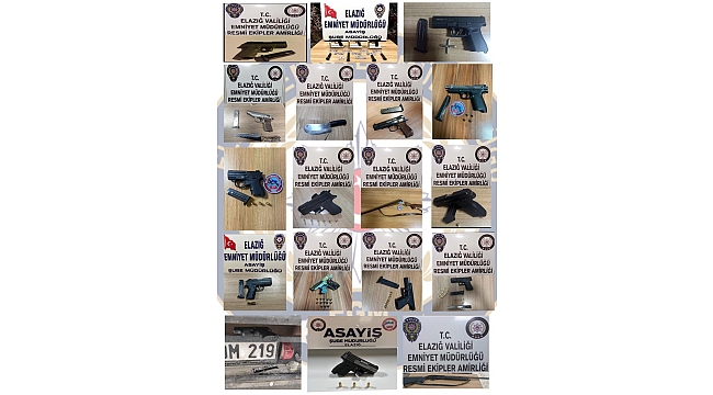 Elazığ Cumhuriyet Başsavcılığı Koordinesinde İl Emniyet Müdürlüğü Asayiş Şube Müdürlüğü tarafından genel güvenlik ve genel asayişin sağlanması, suça konu unsurların tespiti ve şüpheli şahısların yakalanmasına yönelik yapılan uygulamalarda ruhsatsız tabanca-tüfek taşıyan 23 şahıs yakalandı. Yapılan aramalarda, 17 adet ruhsatsız tabanca ve tabancalara ait 68 adet fişek, 2 adet ruhsatsız tüfek, 4 adet kesici alet, 118 adet sentetik ecza maddesi ele geçirildi.