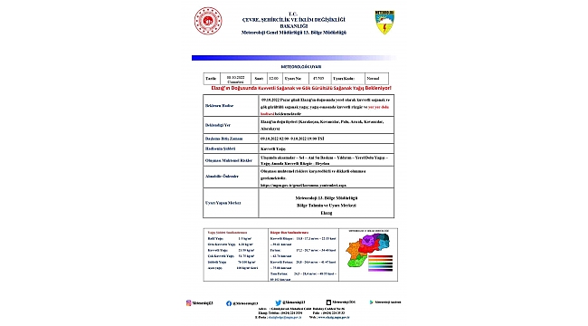 Meteoroloji 13. Bölge Müdürlüğü Bölge Tahmin ve Uyarı Merkezinden yapılan açıklamada, Elazığ'ın doğu ilçelerinde kuvvetli sağanak yağış, yağış esnasında kuvvetli rüzgar ve yer yer dolu yağışının beklendiği belirtildi. Yaşanabilecek olumsuzluklara karşı vatandaşların duyarlı olması istendi.