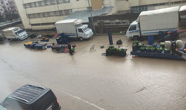 Elazığ'da aniden bastıran kuvvetli sağanak, semt pazarını adeta göle çevirdi. Meteorolojinin uyarılarının ardından etkili olan yağış cadde ve sokakları suyla doldururken, pazarcı esnafı da büyük zarar gördü. Pazar yerinde kurulan tezgahlar sular altında kalırken, sebze ve meyve kasaları sel sularına kapılıp sürüklendi. Şemsiyelerin devrildiği pazarda, tezgahlar da zarar gördü. O anlar cep telefonu kamerasına yansıdı.