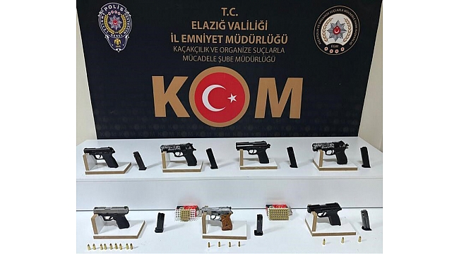 Elazığ Cumhuriyet Başsavcılığı koordinesinde İl Emniyet Müdürlüğü Kaçakçılık ve Organize Suçlarla Mücadele Şube Müdürlüğü ekipleri, piyasaya sürülmek üzere Elazığ'a çok sayıda ruhsatsız silah getirileceği bilgisine ulaştı. Bunun üzerine ekipler tarafından yapılan operasyonda, 7 adet ruhsatsız tabanca ve tabancalara ait 90 adet fişek ele geçirilirken 1 şüpheli ise 'Silah Ticareti Yapmak' suçundan yakalanarak gözaltına alındı.