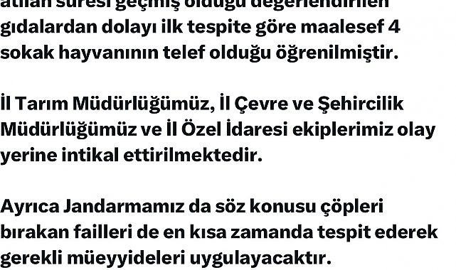 Vali Hatipoğlu, ayrıca sokak hayvanlarına yönelik her türlü insanlık dışı davranışa karşı kurumların yüksek bir duyarlılıkla hareket ettiğini ve bu tür olayların önlenmesi için gerekli tedbirlerin alınacağını ifade etti.