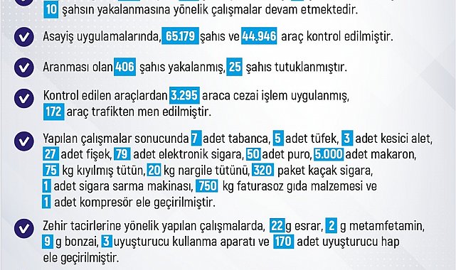 Yapılan çalışmalar sonucunda 7 adet tabanca, 5 adet tüfek, 3 adet kesici alet, 27 adet fişek, 79 adet elektronik sigara, 50 adet puro, 5 bin adet makaron, 75 kilo kıyılmış tütün, 20 kilo nargile tütünü, 320 paket kaçak sigara, 1 adet sigara sarma makinesi, 750 kilo faturasız gıda malzemesi ve 1 adet kompresör ele geçirildi.