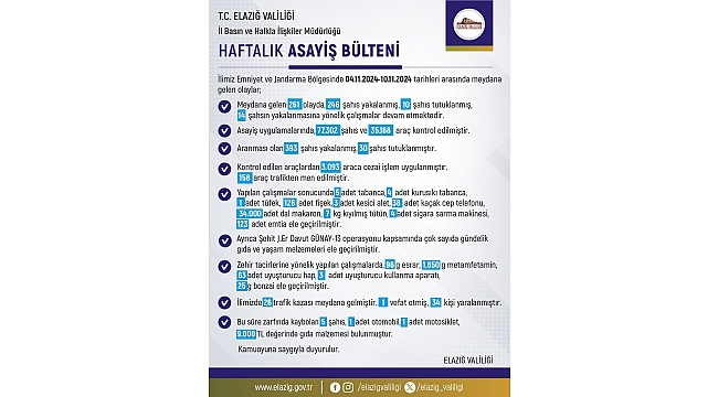 Elazığ'da son bir haftalık asayiş bülteni açıklandı. Buna göre kentte 261 olay meydana gelirken, 246 şahıs yakalandı.