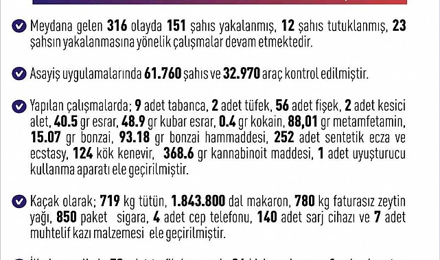 Yapılan çalışmalarda; 9 adet tabanca, 2 adet tüfek, 56 adet fişek, 2 adet kesici alet, 40.5 gram esrar, 48.9 gram kubar esrar, 0.4 gram kokain, 88,01 gram metamfetamin, 15.07 gram bonzai, 93.18 gram bonzai hammaddesi, 252 adet sentetik ecza ve ecstasy, 124 kök kenevir, 368.6 gram kannabinoit maddesi, 1 adet uyuşturucu kullanma aparatı, Kaçak olarak 719 kilogram tütün, 1.843.800 dal makaron, 780 kilogram faturasız zeytin yağı, 850 paket sigara, 4 adet cep telefonu, 140 adet sarj cihazı ve 7 adet muhtelif kazı malzemesi ele geçirildi.