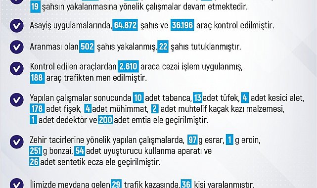 Yapılan çalışmalar sonucunda 10 adet tabanca, 13 adet tüfek, 4 adet kesici alet, 178 adet fişek, 4 adet mühimmat, 2 adet muhtelif kaçak kazı malzemesi, 1 adet detektör ve 200 adet emtia ele geçirildi. Zehir tacirlerine yönelik yapılan çalışmalarda ise 97 gram esrar, 1 gram eroin, 251 gram bonzai, 54 adet uyuşturucu kullanma aparatı ve 26 adet sentetik ecza ele geçirildiği aktarıldı.