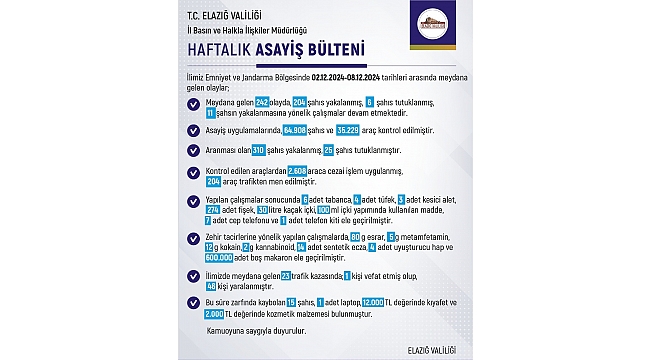 Elazığ'da son bir haftalık asayiş bülteni açıklandı. Buna göre kentte 242 olay meydana gelirken, 204 şahıs yakalandı.
