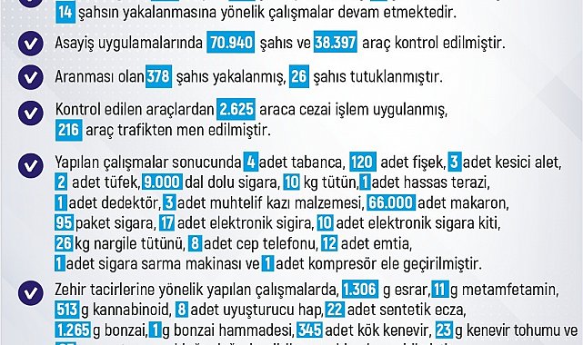 Zehir tacirlerine yönelik yapılan çalışmalarda ise 1,306 gram esrar, 11 gram metamfetamin, 513 gram kannabinoid, 8 adet uyuşturucu hap, 22 adet sentetik ecza, 1.265 gram bonzai, 1 gram bonzai hammadesi, 345 adet kök kenevir, 23 gram kenevir tohumu ve 95 gram uyuşturucu olduğu değerlendirilen madde ele geçirildi.