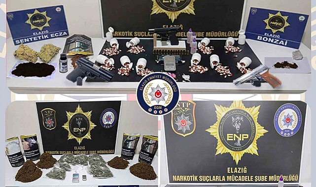 Elazığ Cumhuriyet Başsavcılığı koordinesinde İl Emniyet Müdürlüğü Narkotik Suçlarla Mücadele ve Asayiş Şube Müdürlüğü tarafından uyuşturucu ile mücadele çalışmaları sürüyor. Bu çerçevede son bir ay içerisinde uyuşturucu madde kullanan ve uyuşturucu madde ticareti yapan şahıslara yönelik yapılan operasyonlarda; 67 parça halinde 2 kilo 921 gram sentetik kannabinoid maddesi, 14 parça halinde 1 kilo 990 gram metamfetamin maddesi, 17 parça halinde 1 kilo 175 gram esrar maddesi, 7 parça halinde 79,83 gram kokain maddesi, 1140 adet sentetik ecza maddesi, 5 adet hassas terazi, 4 adet ruhsatsız tabanca ve tabancalara ait 54 adet fişek ele geçirildi.