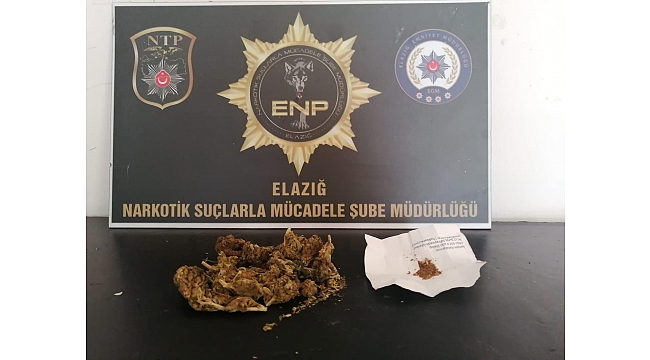 Elazığ Cumhuriyet Başsavcılığı koordinesinde İl Emniyet Müdürlüğü Narkotik Suçlarla Mücadele Şube Müdürlüğü tarafından, uyuşturucu ile mücadele kapsamında uyuşturucu madde kullanan şahıslara ve sokak satıcılarına yönelik yapılan çalışmalarda 7 şüpheli yakalandı. Yapılan ikamet ve üst aramalarında 6 parça halinde 378,98 gram esrar maddesi, bir miktar metamfetamin ve extacy hap ele geçirildi.