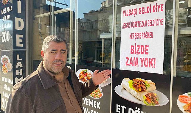 Yeni yılda asgari ücret 22 bin 104 TL olarak belirlendi. Bazı kesimler yılbaşı ve asgari ücretteki artışı fırsat bilerek fahiş fiyat uygularken Elazığ'da lokantası bulunan Murat Karatapan ise örnek bir davranış sergiledi. İş yerinin girişine, 'Yılbaşı ve asgari ücrete zam geldi diye her şeye rağmen bizde zam yok' yazısı asan Karatapan, yapılan zamlara karşı lokantasındaki yemek fiyatlarını 2024 listesi ile aynı tutarak, zam ve fahiş fiyat uygulayan kesime karşı tavrını korudu. Karatapan aynı zamanda iş yerinde boykot ürünlerini de satmadığını ifade etti.