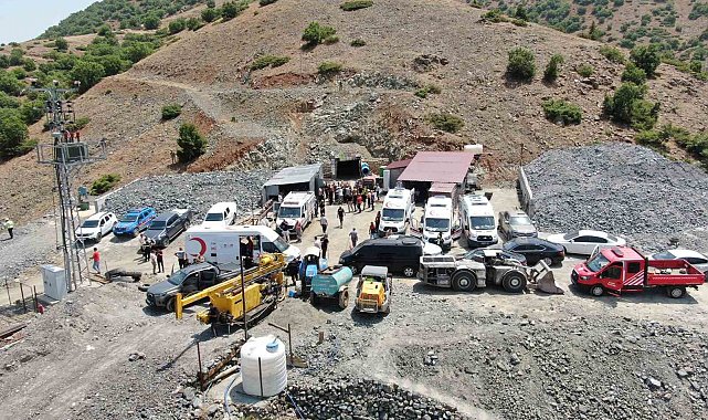 Elazığ'da Polay Madencilik'in işlettiği krom ocağında meydana gelen göçükte kalan işçinin kurtarılması için çalışmalar 4 saattir sürerken bölge dron ile görüntülendi.