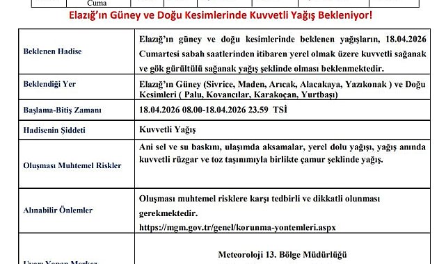 Meteoroloji 13. Bölge Müdürlüğü'nden yapılan açıklamada, "Elazığ'ın güney ve doğu kesimlerinde beklenen yağışların, 18.04.2026 Cumartesi sabah saatlerinden itibaren yerel olmak üzere kuvvetli sağanak ve gök gürültülü sağanak yağış şeklinde olması beklenmektedir. Beklendiği yer Elazığ'ın güney (Sivrice, Maden, Arıcak, Alacakaya, Yazıkonak ) ve doğu kesimleridir ( Palu, Kovancılar, Karakoçan, Yurtbaşı). Oluşması muhtemel riskler; ani sel ve su baskını, ulaşımda aksamalar, yerel dolu yağışı, yağış anında kuvvetli rüzgar ve toz taşınımıyla birlikte çamur şeklinde yağıştır. Oluşması muhtemel risklere karşı tedbirli ve dikkatli olunması gerekmektedir" denildi.