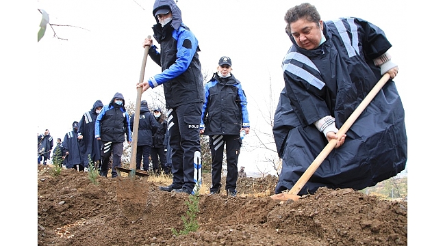Elazığ'da "Bir Fidan Toprağa, Bin Nefes Geleceğe" seferberliği kapsamında başlatılan kampanya kapsamında İl Emniyet Müdürlüğü personeli, Elazığ ve İzmir depreminde hayatını kaybedenlerin anısına binlerce fidanı toprakla buluşturup, dua etti.