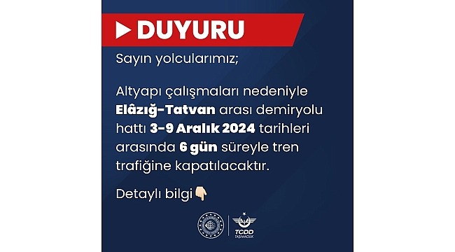 Altyapı çalışmaları nedeniyle Elâzığ-Tatvan demir yolu hattının 3-9 Aralık 2024 tarihleri arasında tren trafiğine kapatılacağı bildirildi. Bu süreçte Van Gölü Ekspresi seferlerinin Elazığ'da sonlandırıp 5 Aralık'ta yeniden hareket edeceği, ayrıca Elazığ-Tatvan arasında planlanan 4 bölgesel tren seferinin iptal edildiği açıklandı.