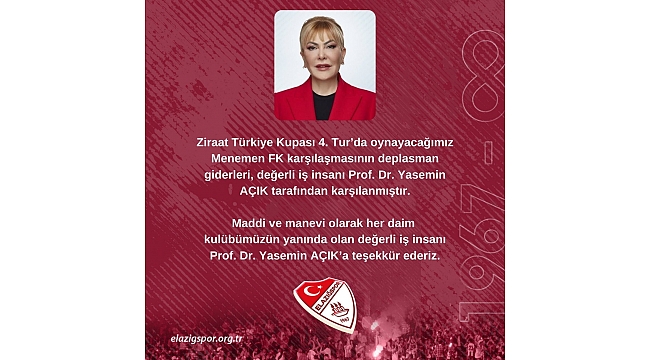 Ziraat Türkiye Kupası 4. turunda Elazığspor İzmir'de Menemen FK ile karşılaşacak. Maç için İzmir'e giden kafileye iş insanı Prof. Dr. Yasemin Açık'tan destek geldi. Elazığspor Kulübünden yapılan teşekkür açıklamasında, ''Ziraat Türkiye Kupası 4. turda oynayacağımız Menemen FK karşılaşmasının deplasman giderleri, değerli iş insanı Prof. Dr. Yasemin Açık tarafından karşılanmıştır. Maddi ve manevi olarak her daim kulübümüzün yanında olan değerli iş insanı Prof. Dr. Yasemin Açık'a teşekkür ederiz" denildi.