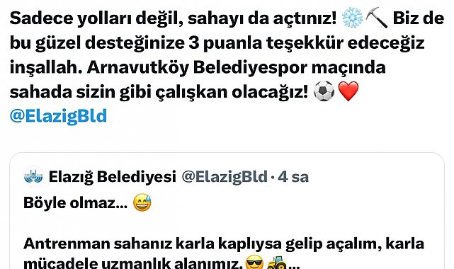 TFF 2. Lig ekibi Elazığspor'un kalecisi Muammer Yıldırım, yoğun kar yağışı sonrası antrenman öncesi "Kar mı yapmış şu Harput'un başına" türküsünü seslendirdi. Bu anlar sosyal medyada büyük ilgi görürken, Elazığ Belediyesi'nden de esprili bir yanıt geldi. Elazığ Belediyesi, Elazığspor'u etiketleyerek, "Böyle olmaz. Antrenman sahanız karla kaplıysa gelip açalım, karla mücadele uzmanlık alanımız. Arnavutköy Belediyespor maçından 3 puan bekliyoruz" paylaşımını yaptı. Bu desteğe kayıtsız kalmayan Elazığspor ise Elazığ Belediyesi'ni etiketleyerek, "Sadece yolları değil, sahayı da açtınız. Biz de bu güzel desteğinize 3 puanla teşekkür edeceğiz inşallah. Arnavutköy Belediyespor maçında sahada sizin gibi çalışkan olacağız" yanıtını verdi.