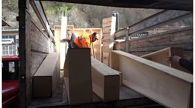 Kahramanmaraş merkezli iki büyük depremin ardından seferber olan Trabzon'un Of ilçesinde bulunan sanayi sitesindeki elektrikçisinden motor ustasına, kaportacısından marangozunu kadar bütün esnaf birleşerek yaptıkları 200 tabutu deprem bölgelerine gönderdi.