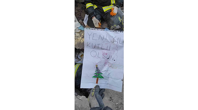 Öte yandan, ekiplerin enkazda yaptığı çalışmalarda, bir çocuğun 2021 yılında resmettiği ve üzerine "Yeni yıl kutlu olsun, depremsiz bir yıl diliyorum" notu görenlerin yüreğini burktu.