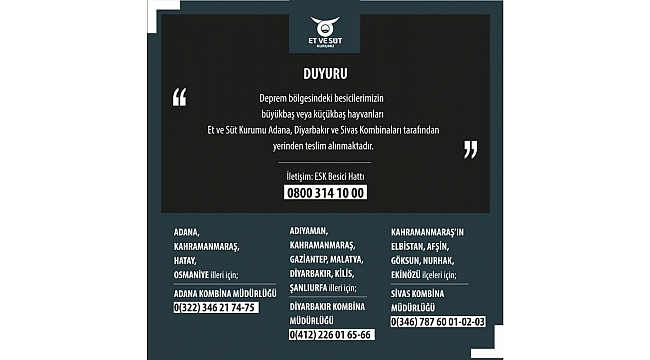 Et ve Süt Kurumu (ESK), depremden etkilenen üreticilerin sahipsiz kalmış veya bakım imkanı olmayan hayvanların mahallinden alındığını bildirdi.