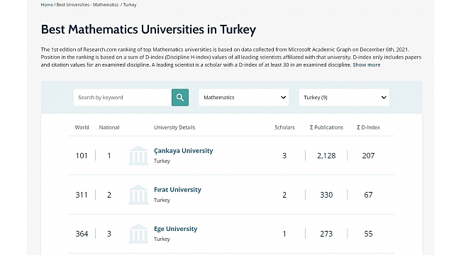 Ayrıca aynı internet sitesinde D-indeks değerleri dikkate alınarak akademisyenler arasında alan bazlı olarak yapılan değerlendirme sonucunda veterinerlik alanında Prof. Dr. Münir Aktaş Türkiye'de 1., makine mühendisliği ve havacılık alanında Prof. Dr. Hakan Fehmi Öztop Türkiye'de 1., biyoloji ve biyokimya alanında Prof. Dr. Kazım Şahin Türkiye'de 2., malzeme bilimi alanında Prof. Dr. Fahrettin Yakuphanoğlu Türkiye'de 4., bilgisayar bilimleri alanında Prof. Dr. Abdulkadir Şengür Türkiye'de 5., matematik alanında Prof. Dr. Hasan Bulut Türkiye'de 5., makine mühendisliği ve havacılık alanında Prof. Dr. Yasin Varol Türkiye'de 8. olarak listeye girmeye hak kazanan akademisyenler oldu.