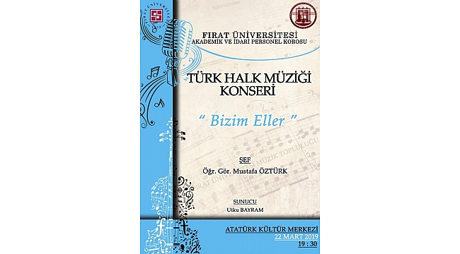 Fırat Üniversitesi Akademik ve İdari personelinden oluşan koro tarafından, 22 Mart 2019 Cuma günü Saat:19.30’da Atatürk Kütür Merkezinde bir konser programı gerçelleştirilecek.“Bizim Eller“ isimli Türk Halk Müziği konserinde, koro üyeleri birbirinden güzel Türk Halk Müziği eserleri seslendirecek.Koro Danışmanı Prof. Dr. Vedat Tanyıldızı, Devlet Konservatuvarı Öğretim görevlisi Şef Mustafa Öztürk yönetiminde düzenlenecek olan konser programına tüm akademik ve idari personeli, öğrencileri ve Elazığ’lı vatandaşları davet etti.