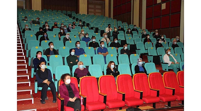 Konferans salonunda yapılan eğitime çok sayıda sağlık çalışanı katıldı.