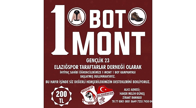 Gençlik 23 Elazığspor Taraftarlar Grubu, örnek bir kampanyaya imza attı. '1 Bot, 1 Mont' ismiyle başlatılan kampanya ile ihtiyaç sahibi öğrencilere yardımda bulunulacak. Kampanyaya katılım bedeli olarak 200 TL fiyat belirlediklerini ifade eden Gençlik 23 Taraftarlar Grubu Başkanı Haker Melih Güneş, "Bu hayır işinde tüm hemşerilerimizin desteklerini bekliyoruz" dedi.