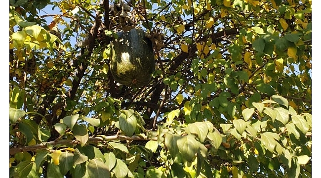 Nazime Arun isimli vatandaş tarafından tohum halindeyken bahçesine ektiği bal kabağı, bahçede bulunan erik ağacının dallarına sürgün gitti. Erik ağacına sürgün giden ve dallara sarılan bal kabağı, ağacın dalında büyümeye başladı. Bu durumu bal kabağının büyümesiyle fark eden bahçe sahibi Arun, kabağı buradan sökmeyerek dalda yetişmesini sağladı. Bal kabağı 10 kiloya ulaşmasına rağmen hala dalda büyümesi görenleri şaşkına çevirdi.