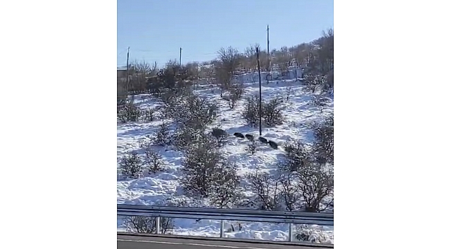 Elazığ'ın tarihi Harput Mahallesinde yiyecek arayan domuz sürüsü vatandaşlar tarafından cep telefonu kamerası ile görüntülendi. Kısa bir süre karlı arazide yiyecek arayan sürü daha sonra hızla koşarak gözden kayboldu.