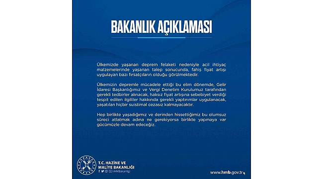 Hazine ve Maliye Bakanlığı'ndan yapılan açıklamada, ''Ülkemizin depremle mücadele ettiği bu elim dönemde, Gelir İdaresi Başkanlığımız ve Vergi Denetim Kurulumuz tarafından gerekli tedbirler alınacak, haksız fiyat artışına sebebiyet verdiği tespit edilen ilgililer hakkında gerekli yaptırımlar uygulanacak, yaşatılan hiçbir suistimal cezasız kalmayacaktır'' denildi.