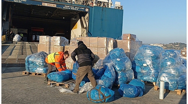 Kahramanmaraş Pazarcık ve Elbistan merkezli depremlerin ardından Muğla'nın Bodrum ilçesinde toplanan yardımlar, kuru yük gemisiyle deprem bölgesine gönderiliyor.