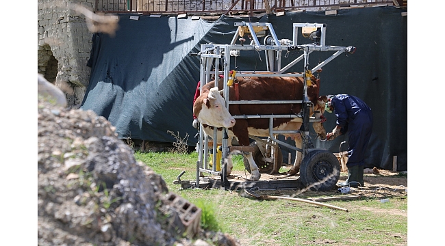 Elazığ'da büyükbaş hayvanların tırnak kesim ve bakımları, özel olarak hazırlanan seyyar araçla veteriner hekim tarafından köy köy gezilerek yapılıyor.