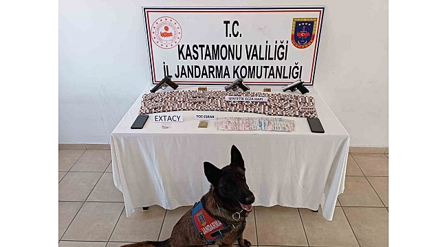 Edinilen bilgiye göre, Kastamonu İl Jandarma Komutanlığı ekiplerince uyuşturucu madde ticaretinin önlenmesine yönelik gerçekleştirilen çalışmalar neticesinde, İstanbul'dan Kastamonu'nun Tosya ilçesine piyasaya sürmek üzere uyuşturucu madde getirdikleri tespit edilen A.B. ve H.Y. isimli şahısların üzerinde ve evlerinde uyuşturucu madde arama köpeği 'Yekten' ile arama yapıldı. Yapılan aramada bin 787 adet sentetik hap, 15 gram toz esrar, 7 adet extacy hap, 3 adet ruhsatsız tabanca ve 19 adet fişek ele geçirildi.