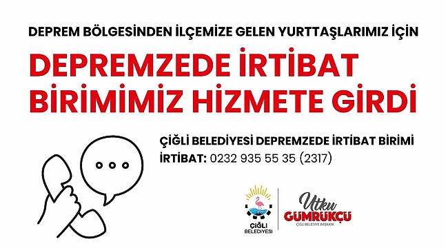İzmirli belediyeler, merkez üssü Kahramanmaraş'ın Pazarcık ilçesi olan ve 10 ili etkileyen 7,7 ile 7,6 büyüklüğündeki depremin ardından başlatmış olduğu yardım kampanyalarını tüm hızıyla sürdürmeye devam ediyor. Başkan Utku Gümrükçü öncülüğünde depremin yaralarını sarmak için seferberlik ilan eden Çiğli Belediyesi, geçici süreliğine İzmir'e gelen depremzedelerin talep ettikleri hizmete ulaşımı konusunda koordinasyonu sağlamak amacıyla Depremzede İrtibat Birimi kurdu. İrtibat biriminde barınma, beslenme ve tedavi gibi temel ihtiyaçların koordinasyonunun yanı sıra psikolojik destek de sağlanacak. Destek almak isteyen depremzedeler 0232 935 55 35 (2317) numaralı hat üzerinden Çiğli Belediyesi Depremzede İrtibat Birimi ile iletişime geçebilecek.