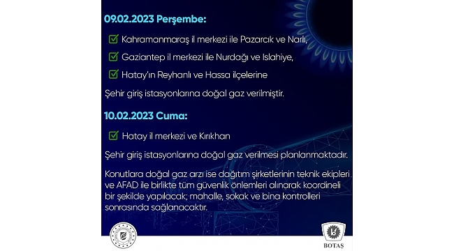 BOTAŞ sosyal medya hesabından deprem bölgelerine doğalgaz verilmesine ilişkin bilgileri paylaştı. Paylaşılan bilgilere göre, Kahramanmaraş il merkezi ile Pazarcık ve Narlı ilçesine, Gaziantep il merkezi ile Nurdağı ve Islahiye ilçesine, Hatay'ın Reyhanlı ve Hassa ilçelerine şehir giriş istasyonlarına doğalgaz verilmeye başlandı. Hatay il merkezi ve Kırıkhan ilçesine ise yarın şehir giriş istasyonlarına doğalgaz verilmesi planlanıyor. Paylaşılan bilgide konutlara doğalgaz arzının ise dağıtım şirketlerinin teknik ekipleri ve AFAD ile birlikte tüm güvenlik önlemleri alınarak koordineli bir şekilde yapılacağı ve mahalle, sokak ve bina kontrolleri sonrasında doğalgaz dağıtımı sağlanacağı belirtildi.