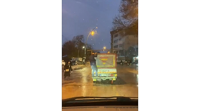 Olay, merkeze bağlı Akpınar Mahallesi Susam Sokak'ta yaşandı. Kimliği belirlenemeyen bir şahıs seyir halindeki kamyonetin arkasına tutunarak ilerlemesi yürekleri ağza getirdi. Canlarını hiçe sayan trafiği de tehlikeye atan şahsın o anları ise bir vatandaşın cep telefonu kamerasına yansıdı.