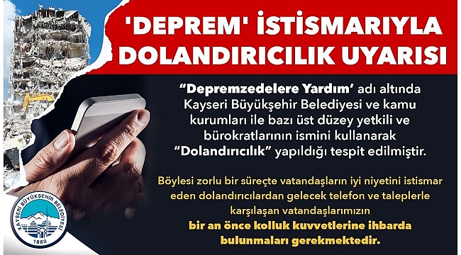 Kayseri Büyükşehir Belediyesi, Türkiye'yi yasa boğan depremlerin ardından, depremzedelere yardım adı altında, dolandırıcılık amaçlı Büyükşehir Belediyesi kurumsal kimliği ile bazı üst düzey yetkili ve bürokratlarının adını kullanarak vatandaşlardan para talep eden dolandırıcılara karşı dikkatli olunması uyarısında bulundu.