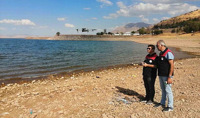 Elazığ'da ekipler, Keban Baraj Gölü'nde dron ile denetim yaptı.