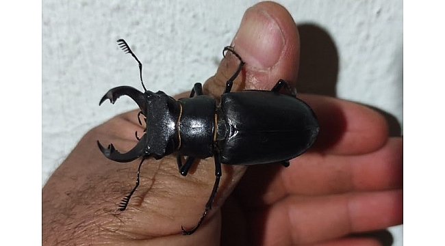 Türkiye'de nesli tükenen türler arasında kırmızı listede bulunan ve yaşam alanlarının genişletilmesi için çalışmalar yürütülen geyik böceği (Lucanus cervus) Elazığ'da görüntülendi.