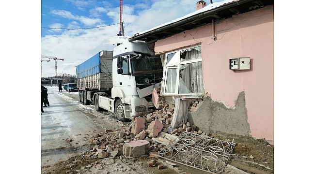 Elazığ'da rampa aşağı inen tır, kaygan yolda kontrolden çıkarak eve çarptı. Kazada sürücü yaralanırken evdekilerin, başka bir odada olması olası bir faciayı önledi.