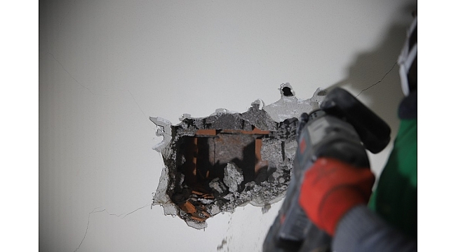 Elazığ depreminin ardından yapımı tamamlanan ve büyük bir çoğunluğu hak sahibine teslim edilen konutların bodrum katındaki taşıyıcı olmayan yerlerdeki çatlakların, yüzeysel olduğu, beton delici ve çekiçli kırım yapılarak gösterildi.