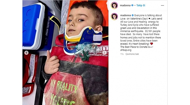 Türkiye'de çok sayıda seveni bulunan Madonna, yardım çağrısı yaptığı paylaşımda Türkiye'den çekilen fotoğrafları kullandı. Ünlü sanatçının paylaşımında, Gaziantep'in Nurdağı ilçesinde ailesiyle enkaz altında kalan 5 yaşındaki Hasan Yücel'in 130. saatte canlı olarak enkazdan çıkarıldıktan sonra çekilen bir fotoğrafı yer aldı.