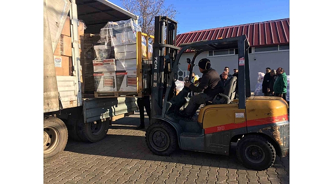 Amiral Orhan Aydın Kapalı Spor Salonu'nda oluşturulan yardım merkezinde toplanan malzemeler kayıt altına alınarak tasnif edildi. Ardından kutulara konulan yardımlar bölgeye ulaştırılmak üzere tırlara yüklendi.