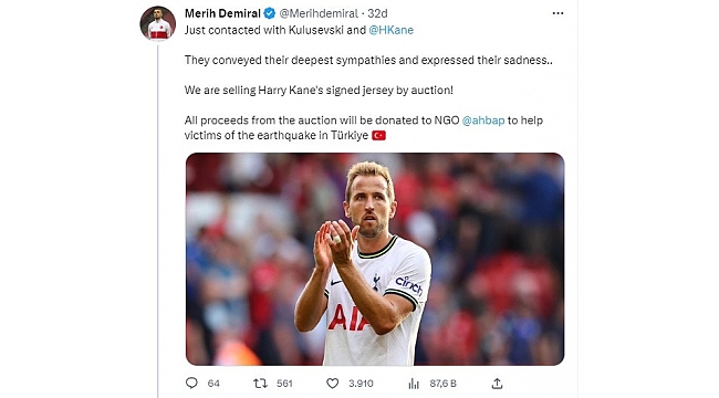 Merih Demiral'ın başlattığı kampanyaya Ronaldo, Dybala ve Bonucci, Morata, Griezmann'ın ardından Tottenham'ın yıldızları Harry Kane ve Kulsevski de destek verdi. İki oyuncunun imzalı forması da açık artırmayla satılacak ve elde edilecek gelir Türkiye'deki depremzedelere bağışlanacak.